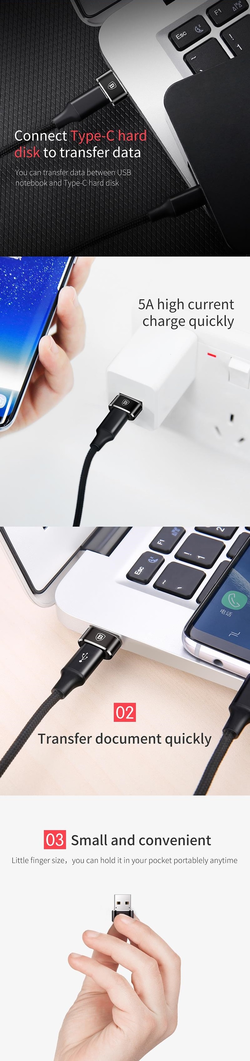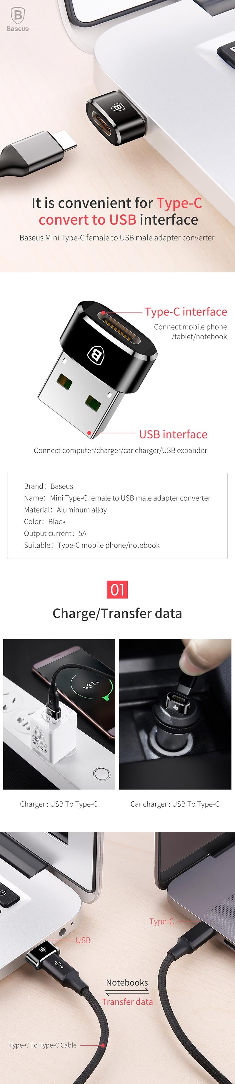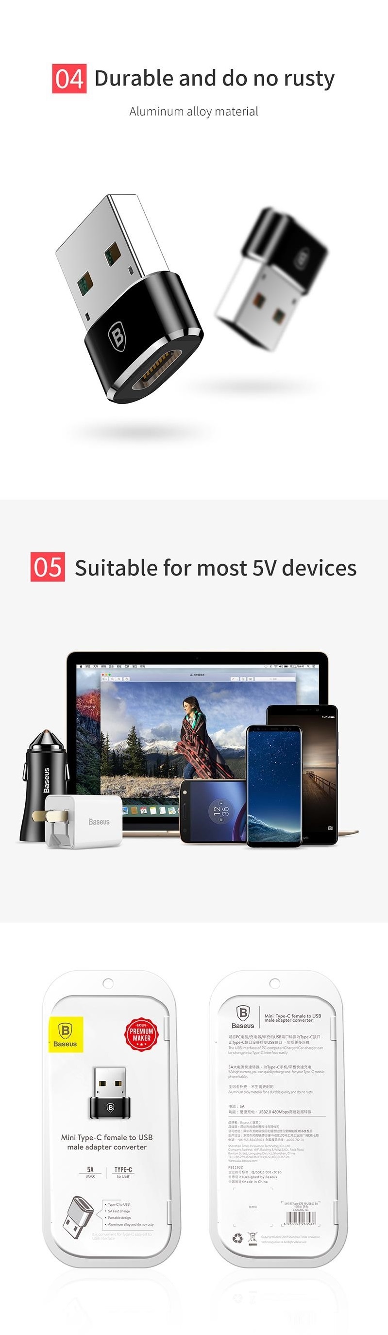 מתאם USB זכר ל TYPE C נקבה - מאפשר חיבור מוצרי TYPE C לשקעי USB רגילים - תומך טעינה מהירה - BASEUS